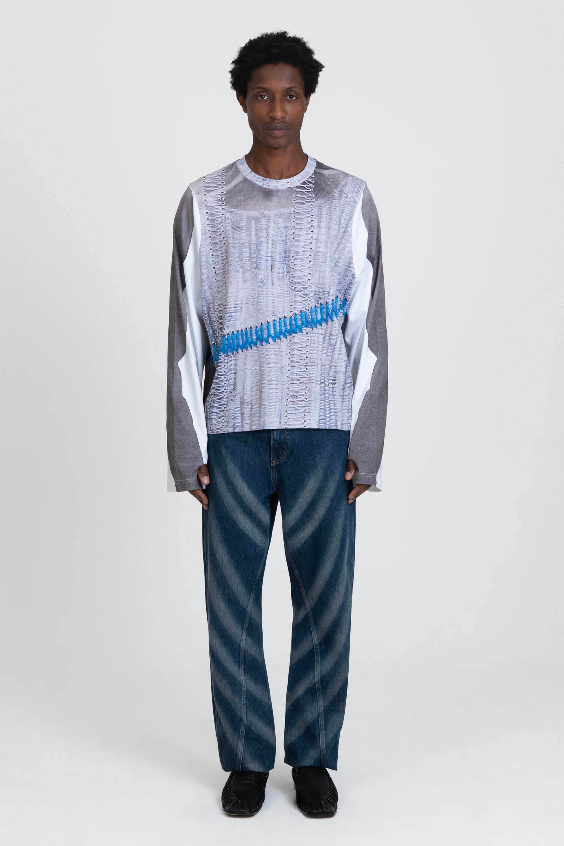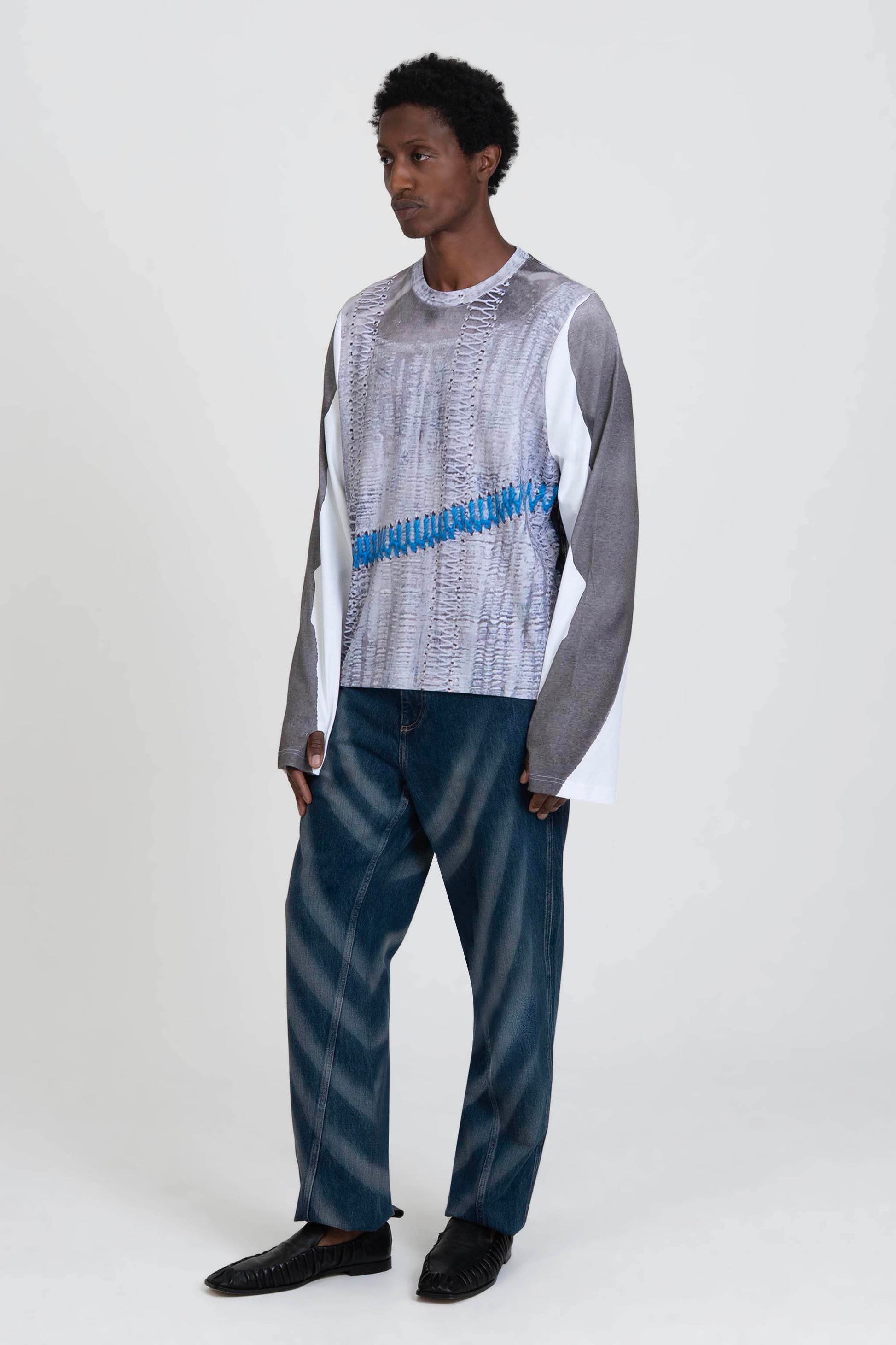 The Figure Top is a new Bianca Saunders wardrobe staple. This Long sleeved top, has a set in self neckline and features thumb holes on both sleeve cuffs. This seasons print is an exclusive artwork by Troy Montes-Michie.