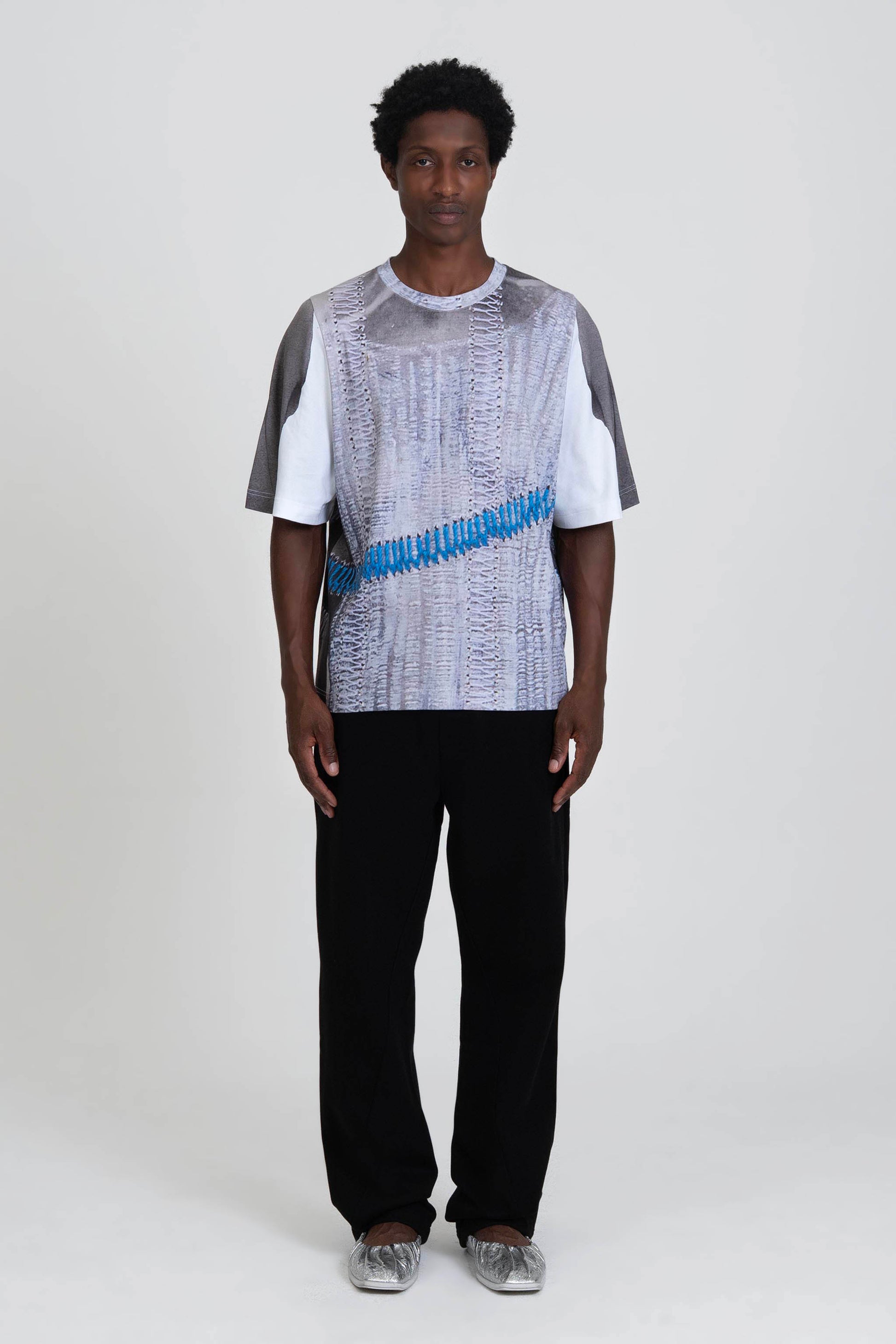 The Replace top is a new Bianca Saunders staple. The relaxed loose fit short sleeved t-shirt has a set in self neckline. This seasons print is an exclusive artwork by Troy Montes-Michie.